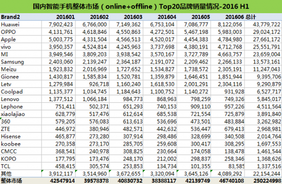 此外,cnBeta互联网IT新闻网站去年8月25日曾报道,市场研究公司赛诺(Sino)发布了2016年上半年中国智能手机Top20品牌销量报告。数据显示,2016年上半年国内智能手机整体市场销量为2.5亿,其中华为销售量达4377万,坐稳国内市场的头把交椅。而OPPO、苹果分别以2902万和2766万的销量分列二、三位。此外,vivo和小米的销售量分别为2555万和2365万,位列第四和第五。