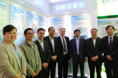 王兵董事长(右一)陪同莱昂·图森特(Leon Tossaint 右二)、段永刚秘书长(左一)参观北新建材展示中心王
