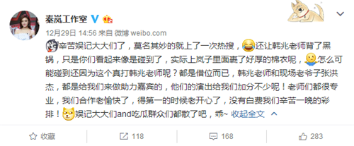 关于秦岚被袭胸的消息传出之后,男演员韩兆也受到众多网友的指责和吐槽,而秦岚工作室也就此事发声明澄清并未被袭胸,“还让韩兆老师背了黑锅,只是你们看起来像是碰到了,实际上岚子里面裹了好厚的棉衣呢,怎么可能碰到还因为这个真打韩兆老师呢?”还透露之前演出合作很愉快。
